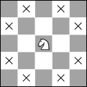 Knight: The knight always moves by "jumping" two squares in one cardinal direction and one square in a direction perpendicular to the first. There are 8 possible squares that a knight can move to from a given position, and these are shown in the figure below.