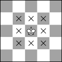 King: The king can move in any of the eight cardinal and diagonal directions but by one square only. Put another way, the king can only move into the eight immediately adjacent squares. As such, this makes the king one of the weakest pieces on the board.